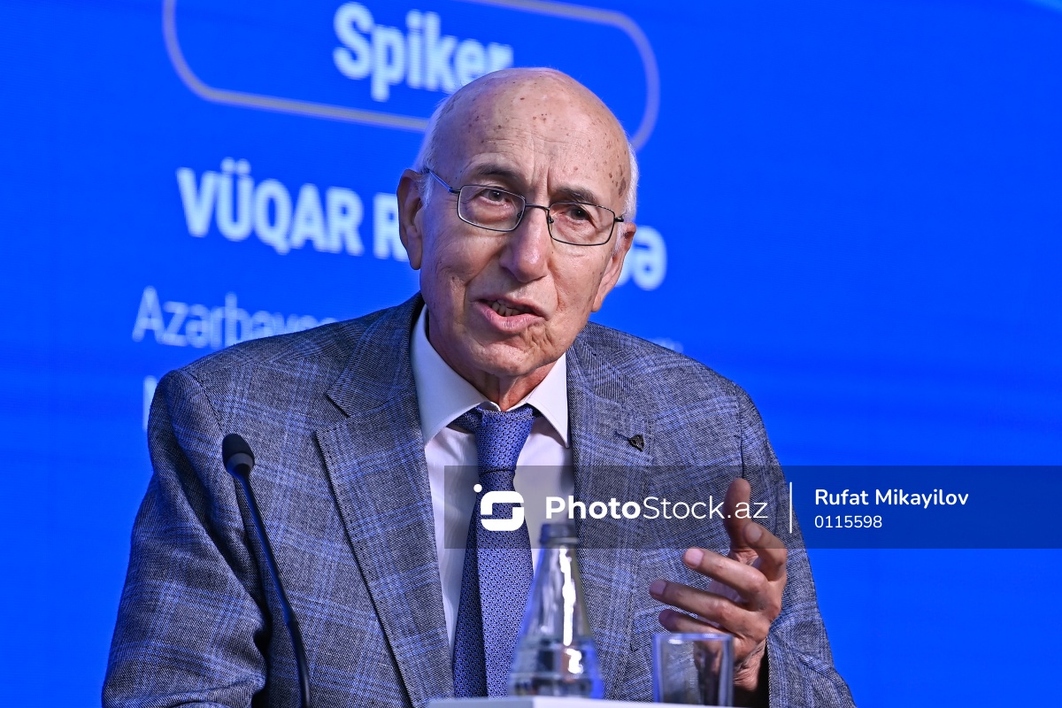 “Medianın inkişafında Ümummilli Lider Heydər Əliyevin rolu” mövzusunda konfransın panel sessiyasında iştirak edən YAP İdarə Heyətinin üzvü və Veteranlar Şurasının sədri Arif Rəhimzadə.