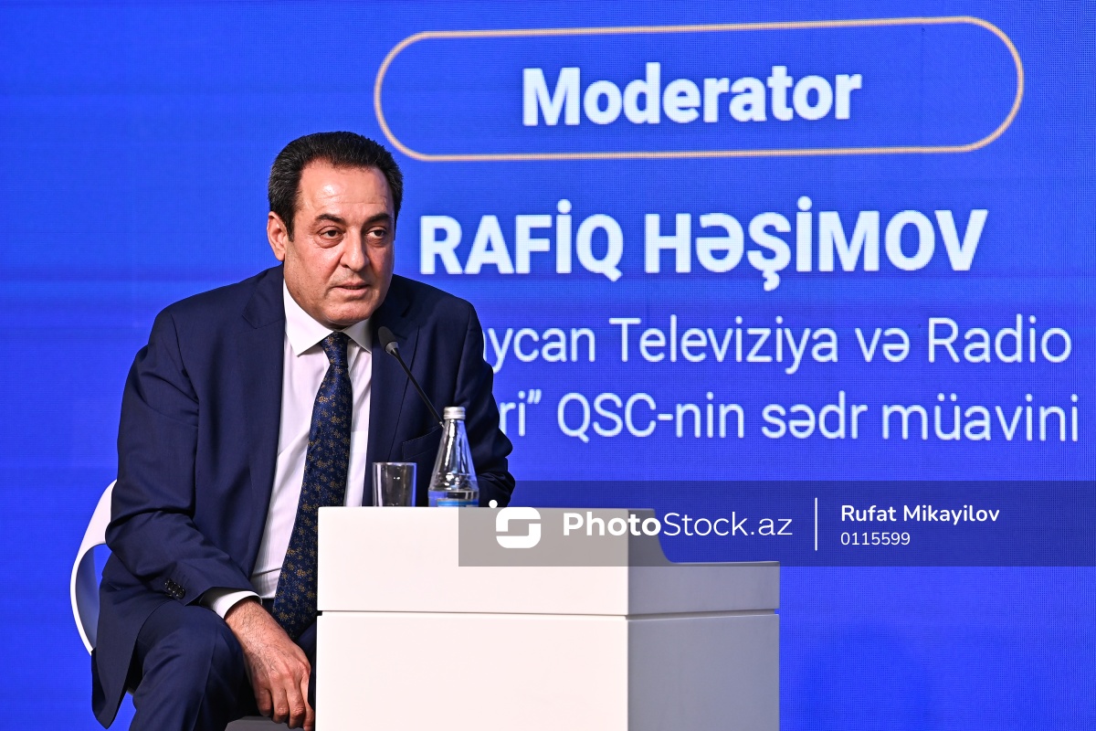 “Medianın inkişafında Ümummilli Lider Heydər Əliyevin rolu” mövzusunda konfransın panel sessiyasında iştirak edən Azərbaycan Televiziya və Radio verilişləri QSC-nin sədr müavini Rafiq Həşimov.