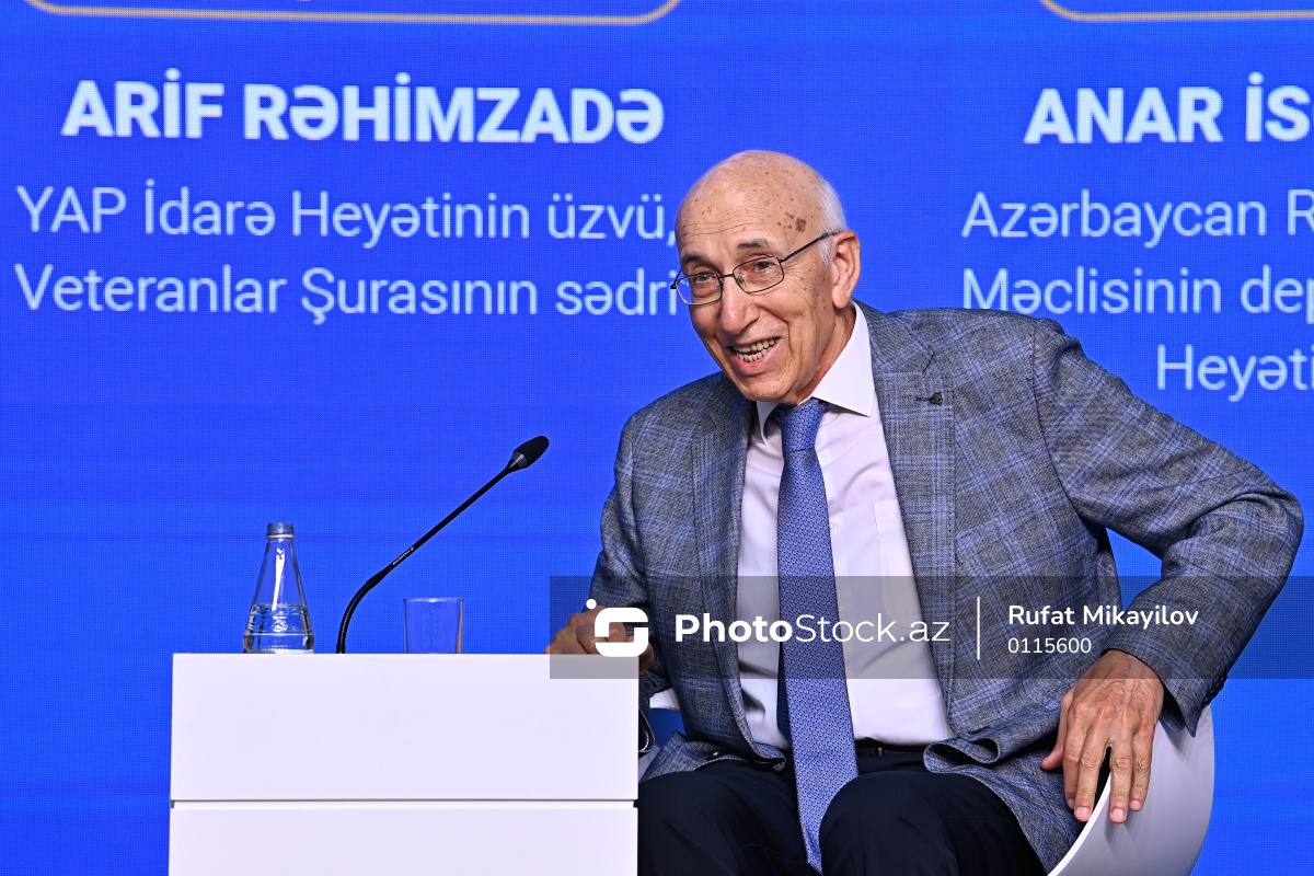 “Medianın inkişafında Ümummilli Lider Heydər Əliyevin rolu” mövzusunda konfransın panel sessiyasında iştirak edən YAP İdarə Heyətinin üzvü və Veteranlar Şurasının sədri Arif Rəhimzadə.