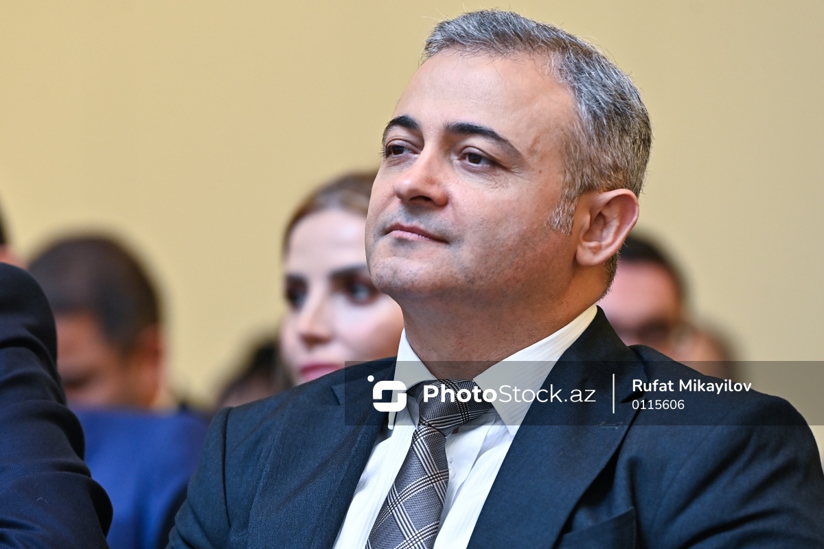 “Medianın inkişafında Ümummilli Lider Heydər Əliyevin rolu” mövzusunda konfransda iştirak edən "Azərbaycan Televiziya və Radio Verilişləri" QSC-nin (AzTV) sədri Rövşən Məmmədov.