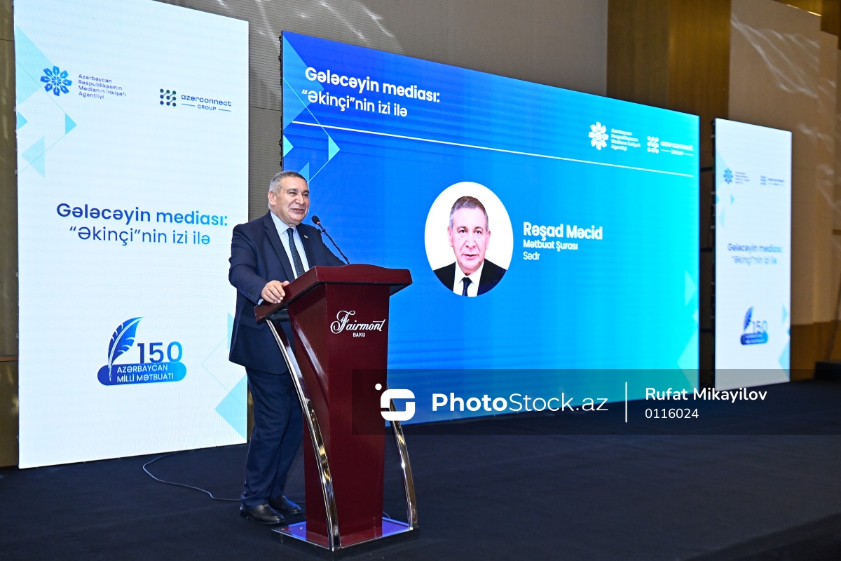 "Gələcəyin mediası: "Əkinçi"nin izi ilə" mövzusunda keçirilən forumda çıxış edən Mətbuat Şurasının sədri Rəşad Məcid.