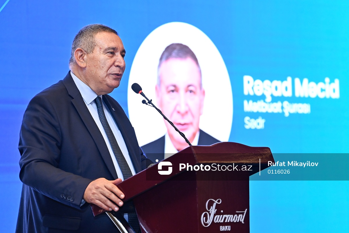 "Gələcəyin mediası: "Əkinçi"nin izi ilə" mövzusunda keçirilən forumda çıxış edən Mətbuat Şurasının sədri Rəşad Məcid.