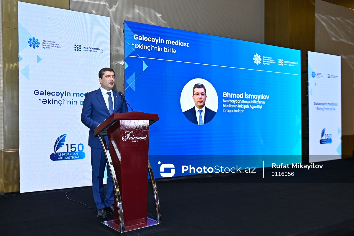 "Gələcəyin mediası: "Əkinçi"nin izi ilə" mövzusunda keçirilən forumda çıxış edən Medianın İnkişafı Agentliyinin İcraçı direktoru Əhməd İsmayılov.