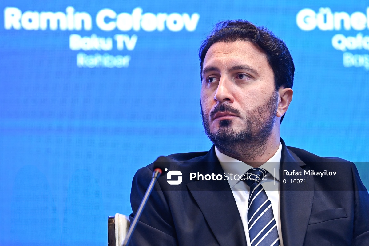 "Gələcəyin mediası: "Əkinçi"nin izi ilə" mövzusunda keçirilən forum çərçivəsində "Gələcəyin mediasına baxış: jurnalistika gələcəyin peşəsi kimi" mövzusunda panel sessiyada iştirak edən "BAKU" TV-nin rəhbəri Ramin Cəfərov.
