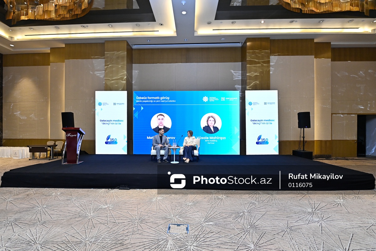 "Gələcəyin mediası: "Əkinçi"nin izi ilə" mövzusunda keçirilən forum çərçivəsində “Media peşəkarlığı və yeni nəsil jurnalistika” mövzusunda panel sessiyanın moderatoru Mətin Ələsgərov (sol) və "APA Media Group”un baş direktoru Vüsalə Mahirqızı (sağ).