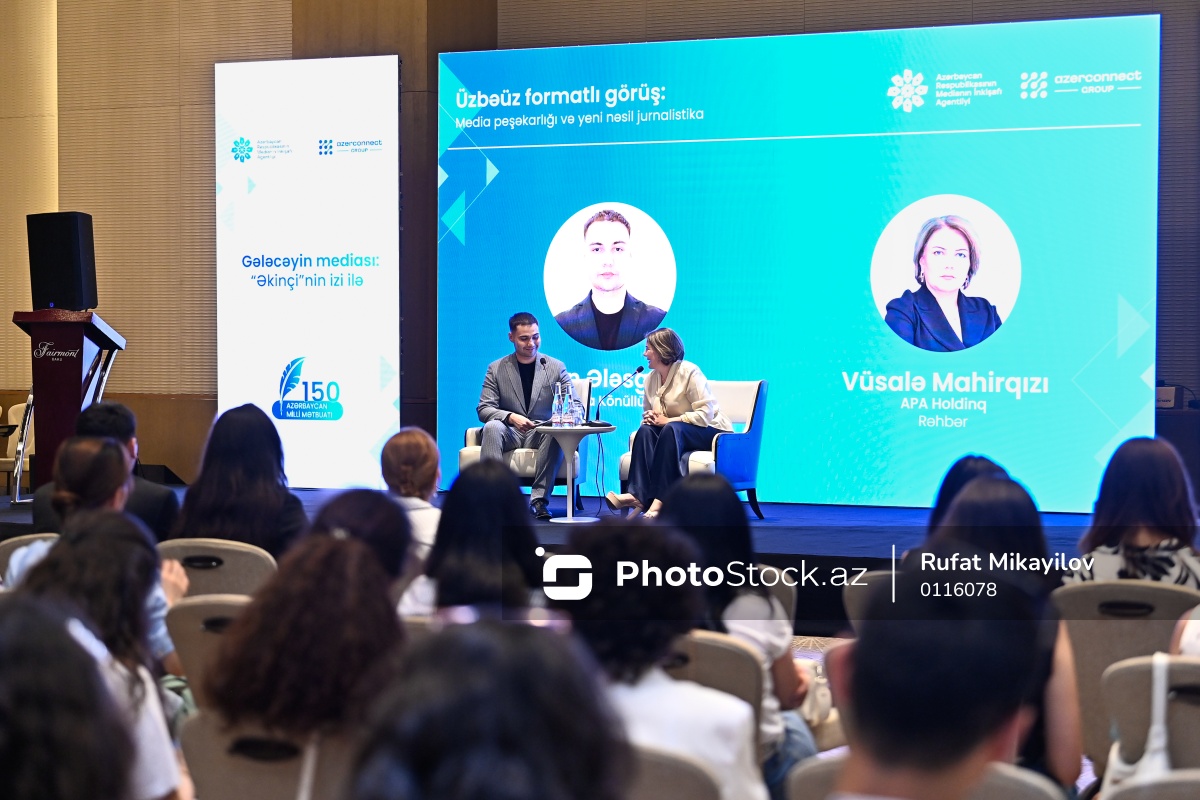 "Gələcəyin mediası: "Əkinçi"nin izi ilə" mövzusunda keçirilən forum çərçivəsində “Media peşəkarlığı və yeni nəsil jurnalistika” mövzusunda panel sessiyanın moderatoru Mətin Ələsgərov (sol) və "APA Media Group”un baş direktoru Vüsalə Mahirqızı (sağ).