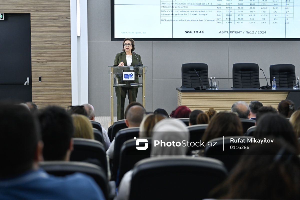 Dövlət İmtahan Mərkəzinin İdarə Heyətinin sədri Məleykə Abbaszadə 2024/2025-ci tədris ili üçün ali təhsil müəssisələrinin bakalavriat səviyyəsinə tələbə qəbulu imtahanlarının nəticələrinin elmi-statistik təhlili ilə bağlı tədbirdə çıxış edib.