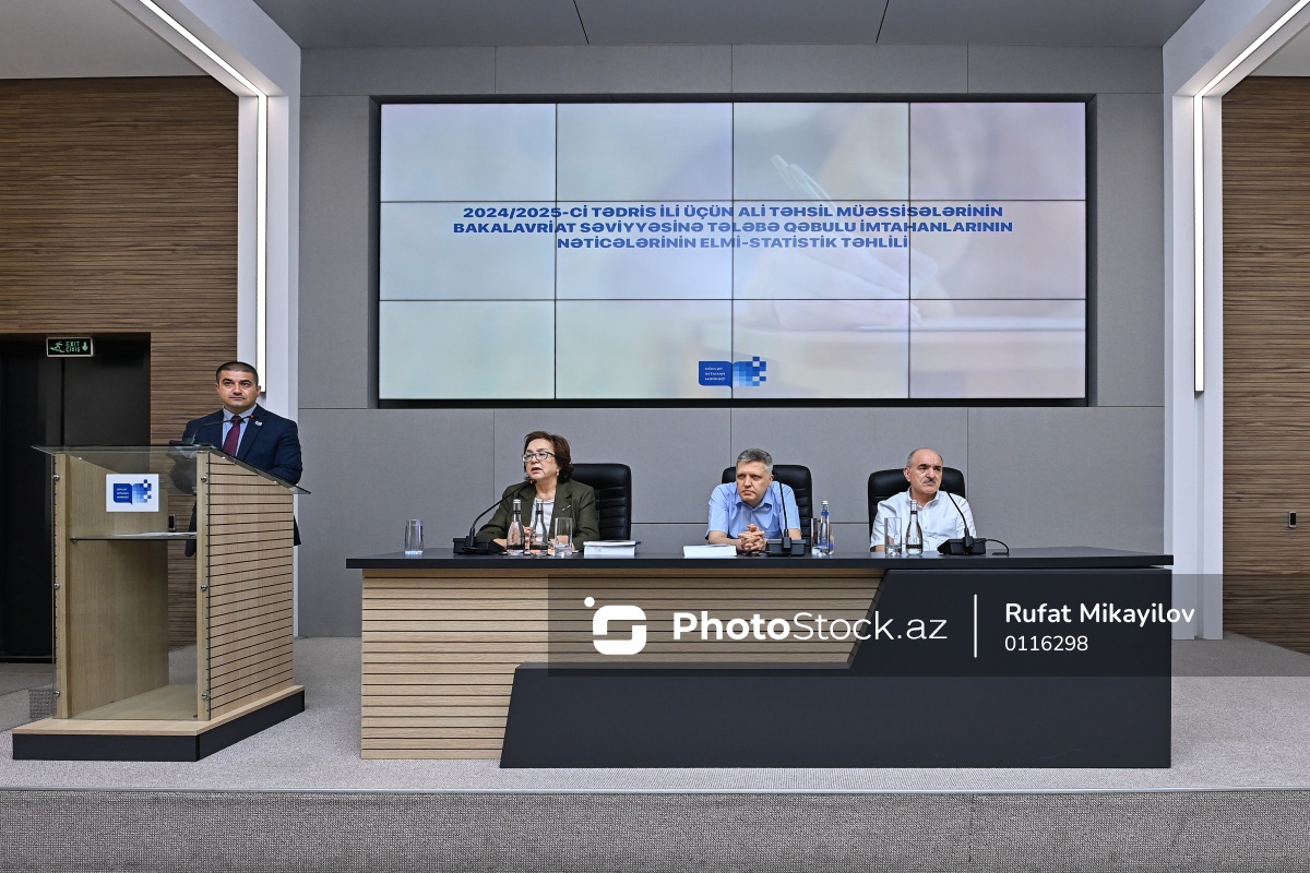 Dövlət İmtahan Mərkəzinin 2024/2025-ci tədris ili üçün ali təhsil müəssisələrinin bakalavriat səviyyəsinə tələbə qəbulu imtahanlarının nəticələrinin elmi-statistik təhlili ilə bağlı tədbirində iştirak edən (soldan-sağa) DİM-in mətbuat katibi Xanlar Xanlarov, DİM-in İdarə Heyətinin sədri Məleykə Abbaszadə, DİM-in Statistik araşdırmalar, elmi layihələşdirmə və innovasiyalar departamentinin müdiri Oleq Şelaqinov, DİM-in Yoxlama-ölçmə materiallarının işlənməsi departamentinin müdiri Natiq Əliyev.