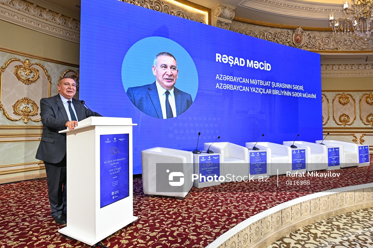 Şamaxıda “Müasir informasiya məkanı və dini etiqad azadlığı” mövzusunda keçirilən konfransda çıxış edən Azərbaycan Mətbuat Şurasının sədri Rəşad Məcid.