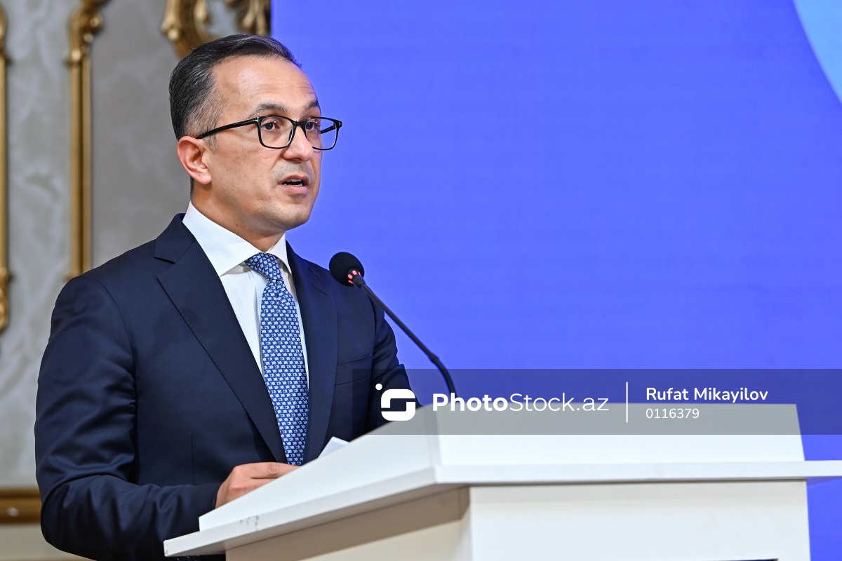 Şamaxıda “Müasir informasiya məkanı və dini etiqad azadlığı” mövzusunda keçirilən konfransda çıxış edən Dini Qurumlarla İş üzrə Dövlət Komitəsinin (DQİDK) sədri Ramin Məmmədov.