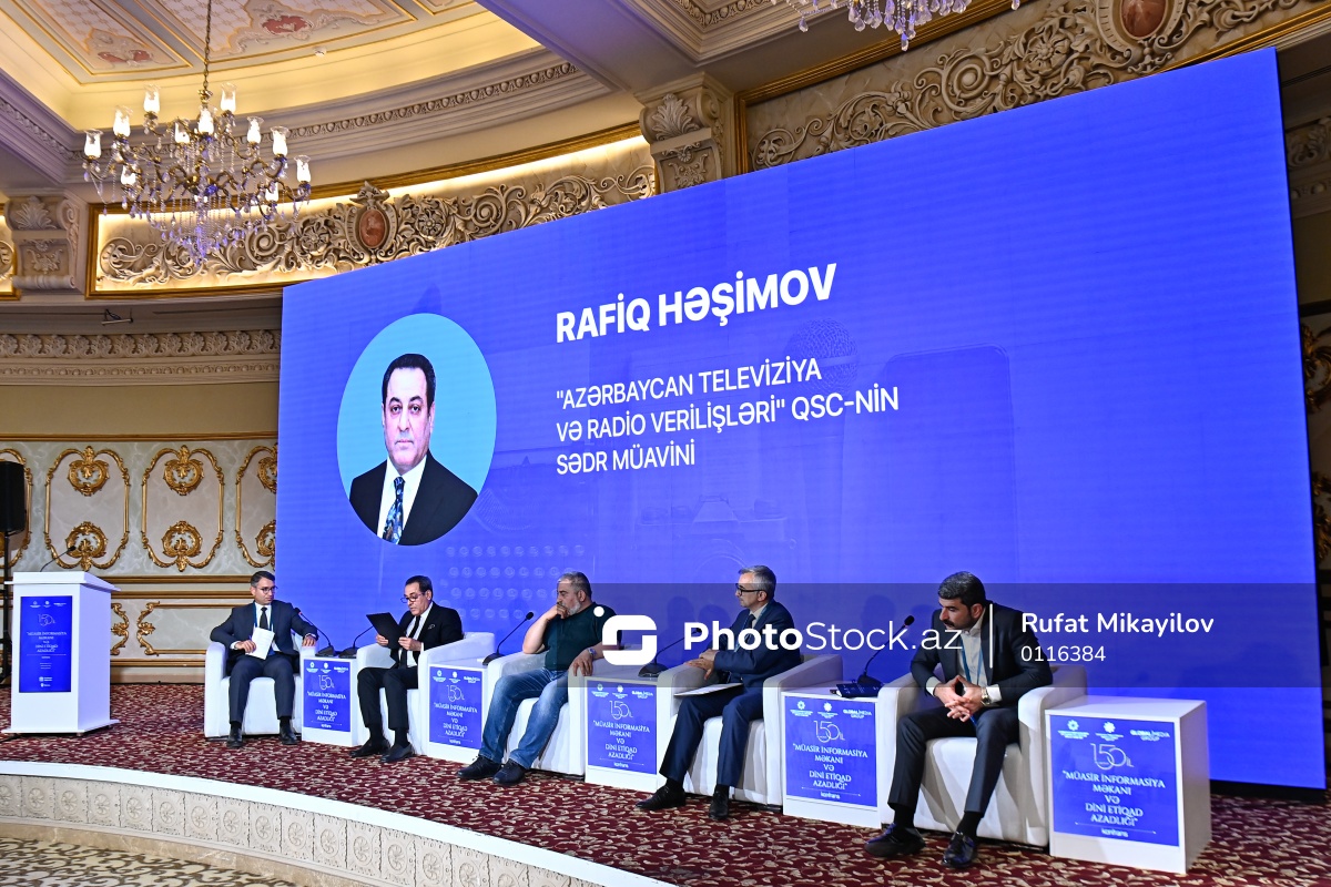 Şamaxıda “Müasir informasiya məkanı və dini etiqad azadlığı” mövzusunda keçirilən konfrans çərçivəsində “Din-media münasibətləri: yeni hədəf və çağırışlar” adlı panel sessiyada iştirak edən (soldan-sağa) Dini Qurumlarla İş üzrə Dövlət Komitəsinin sədr müavini Gündüz İsmayılov, “Azərbaycan Televiziya və Radio Verilişləri” QSC-nin sədr müavini Rafiq Həşimov, “Milli.az” saytının baş redaktoru Elçin Alıoğlu, “Report İnformasiya Agentliyi” MMC-nin direktoru və Mənəvi Dəyərlərin Təbliği Fondunun Himayəçilik Şurasının üzvü Fuad Hüseynəliyev, şair-yazıçı Şəhriyar Del Gerani.