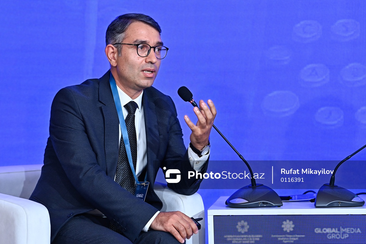 Şamaxıda “Müasir informasiya məkanı və dini etiqad azadlığı” mövzusunda keçirilən konfrans çərçivəsində “Din-media münasibətləri: yeni hədəf və çağırışlar” adlı panel sessiyada çıxış edən Dini Qurumlarla İş üzrə Dövlət Komitəsinin sədr müavini Gündüz İsmayılov.