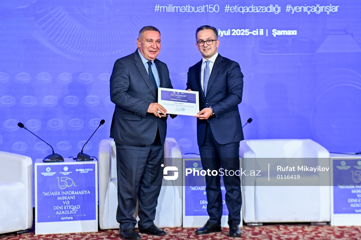 Şamaxı şəhərində “Müasir informasiya məkanı və dini etiqad azadlığı” mövzusunda konfrans çərçivəsində mükafatlandırma mərasimində iştirak edən Azərbaycan Mətbuat Şurasının sədri Rəşad Məcid (sol) və Dini Qurumlarla İş üzrə Dövlət Komitəsinin sədri Ramin Məmmədov (sağ).