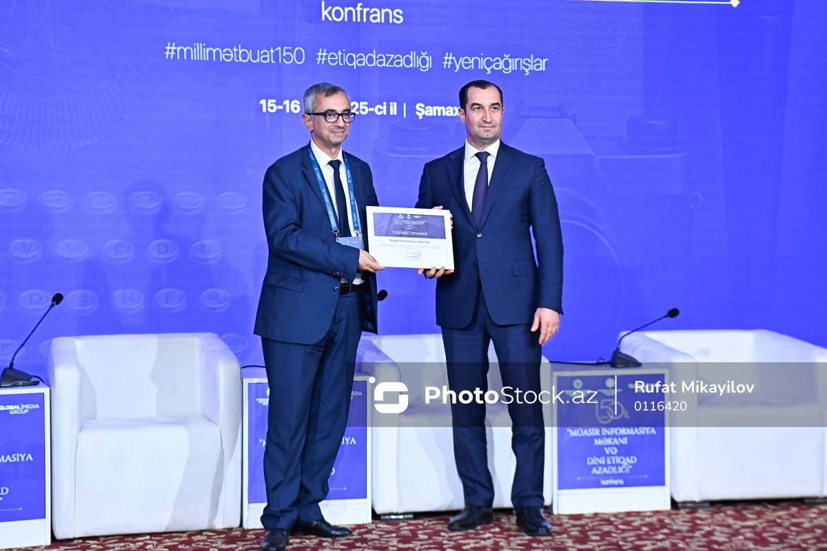 Şamaxı şəhərində “Müasir informasiya məkanı və dini etiqad azadlığı” mövzusunda konfrans çərçivəsində mükafatlandırma mərasimində iştirak edən “Report İnformasiya Agentliyi” MMC-nin direktoru Fuad Hüseynəliyev (sol) və Şamaxı Rayon İcra Hakimiyyətinin başçısı Tahir Məmmədov (sağ).