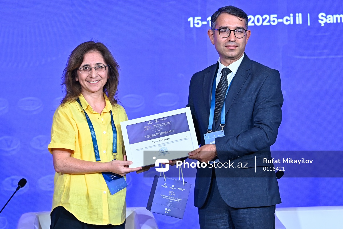 Şamaxı şəhərində “Müasir informasiya məkanı və dini etiqad azadlığı” mövzusunda konfrans çərçivəsində mükafatlandırma mərasimində iştirak edən Oxu.Az-ın müxbiri Əzizə İsmayılova (sol) və Dini Qurumlarla İş üzrə Dövlət Komitəsinin sədr müavini Gündüz İsmayılov (sağ).