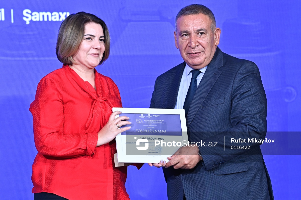 Şamaxı şəhərində “Müasir informasiya məkanı və dini etiqad azadlığı” mövzusunda konfrans çərçivəsində mükafatlandırma mərasimində iştirak edən "APA Media Group”un baş direktoru Vüsalə Mahirqızı (sol) və Azərbaycan Mətbuat Şurasının sədri Rəşad Məcid (sağ).