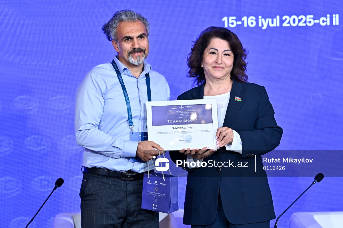 Şamaxı şəhərində “Müasir informasiya məkanı və dini etiqad azadlığı” mövzusunda konfrans çərçivəsində mükafatlandırma mərasimində iştirak edən "AzVision.az" saytının baş redaktoru Vüsal Məmmədov (sol) və Milli Məclisin deputatı Tamam Cəfərova (sağ).
