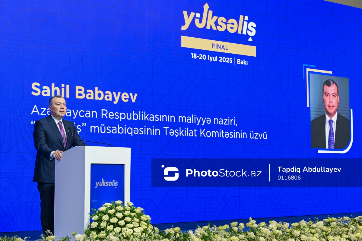"Yüksəliş” müsabiqəsinin beşinci mövsümünün final mərhələsində çıxış edən Azərbaycan Respublikasının maliyyə naziri, "Yüksəliş" Təşkilat Komitəsinin üzvü Sahil Babayev.