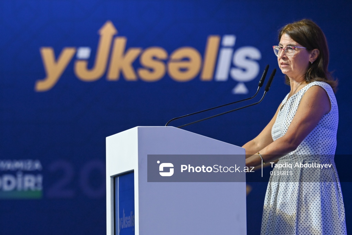 "Yüksəliş” müsabiqəsinin beşinci mövsümünün final mərhələsində çıxış edən Prezident Administrasiyasının Humanitar siyasət, diaspor, multikulturalizm və dini məsələlər şöbəsinin müdiri, "Yüksəliş" müsabiqəsinin Təşkilat Komitəsinin sədri Fərəh Əliyeva.