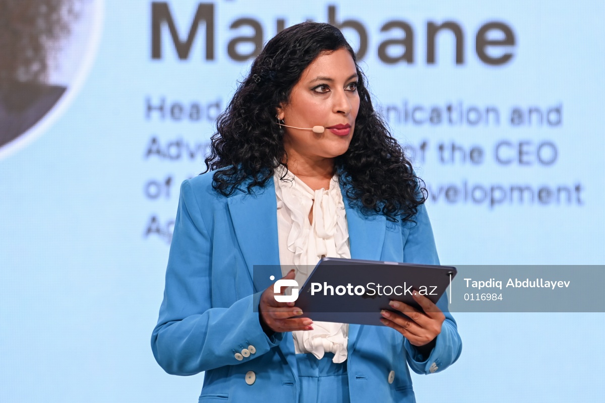 III Şuşa Qlobal Media Forumunun üçüncü günü çərçivəsində keçirilən  "Rəqəmsal keçidlər: süni intellekt dövründə informasiya və media dayanıqlılığının gücləndirilməsi" mövzusunda panelin moderatoru beynəlxalq xəbər aparıcısı və jurnalist Nadira Tudor.