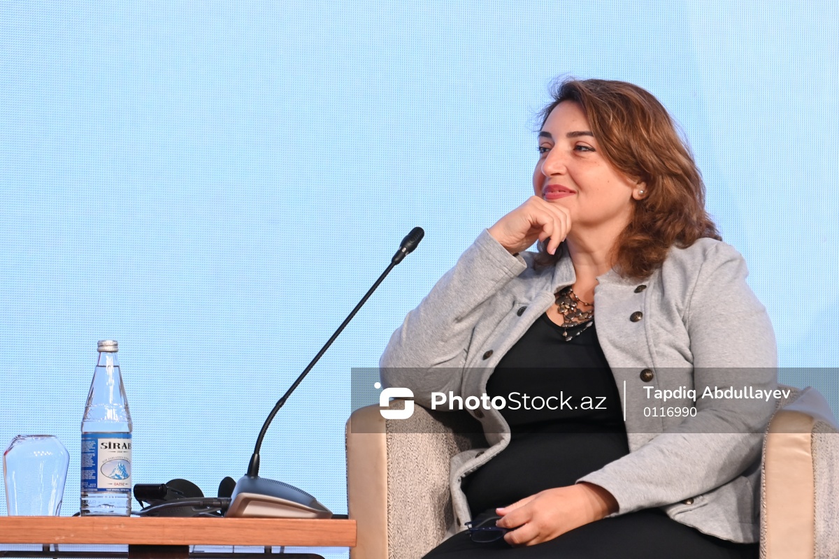 III Şuşa Qlobal Media Forumunun üçüncü günü çərçivəsində keçirilən  "Rəqəmsal keçidlər: süni intellekt dövründə informasiya və media dayanıqlılığının gücləndirilməsi" mövzusunda paneldə iştirak edən ADA Universitetinin Kommunikasiya və rəqəmsal media ixtisasının müəllimi Şəfəq Mehrəliyeva.