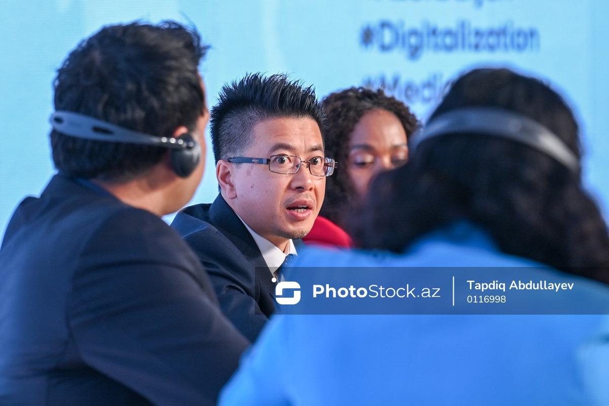III Şuşa Qlobal Media Forumunun üçüncü günü çərçivəsində keçirilən  "Rəqəmsal keçidlər: süni intellekt dövründə informasiya və media dayanıqlılığının gücləndirilməsi" mövzusunda paneldə iştirak edən Çin Media Qrupunun Avrasiya Bürosunun baş redaktorunun birinci müavini Vanq Delu.