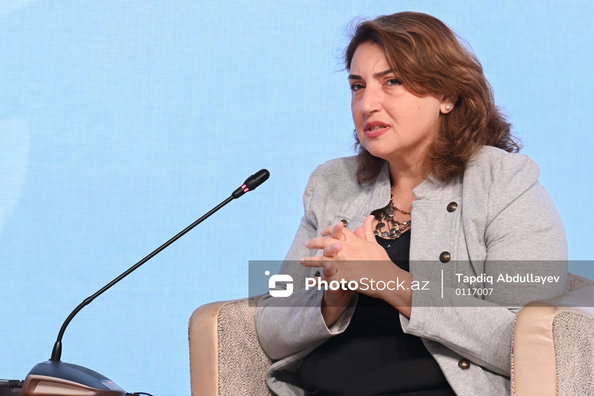 III Şuşa Qlobal Media Forumunun üçüncü günü çərçivəsində keçirilən  "Rəqəmsal keçidlər: süni intellekt dövründə informasiya və media dayanıqlılığının gücləndirilməsi" mövzusunda paneldə iştirak edən ADA Universitetinin Kommunikasiya və rəqəmsal media ixtisasının müəllimi Şəfəq Mehrəliyeva.