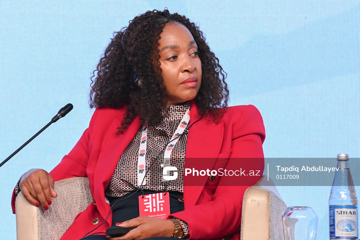 III Şuşa Qlobal Media Forumunun üçüncü günü çərçivəsində keçirilən  "Rəqəmsal keçidlər: süni intellekt dövründə informasiya və media dayanıqlılığının gücləndirilməsi" mövzusunda paneldə iştirak edən Afrika İttifaqı İnkişaf Agentliyinin Kommunikasiya və təbliğat şöbəsinin rəhbəri Ziphora Maubane.