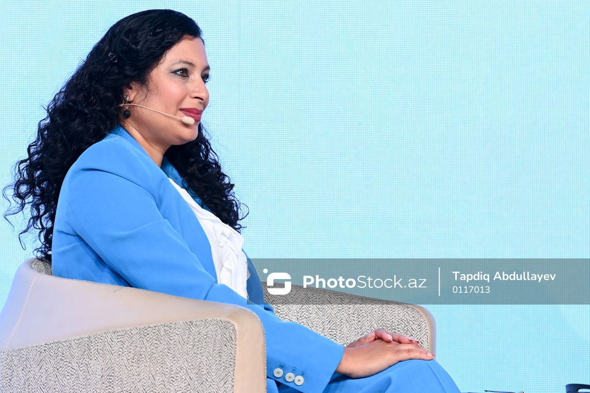 III Şuşa Qlobal Media Forumunun üçüncü günü çərçivəsində keçirilən  "Rəqəmsal keçidlər: süni intellekt dövründə informasiya və media dayanıqlılığının gücləndirilməsi" mövzusunda panelin moderatoru beynəlxalq xəbər aparıcısı və jurnalist Nadira Tudor.