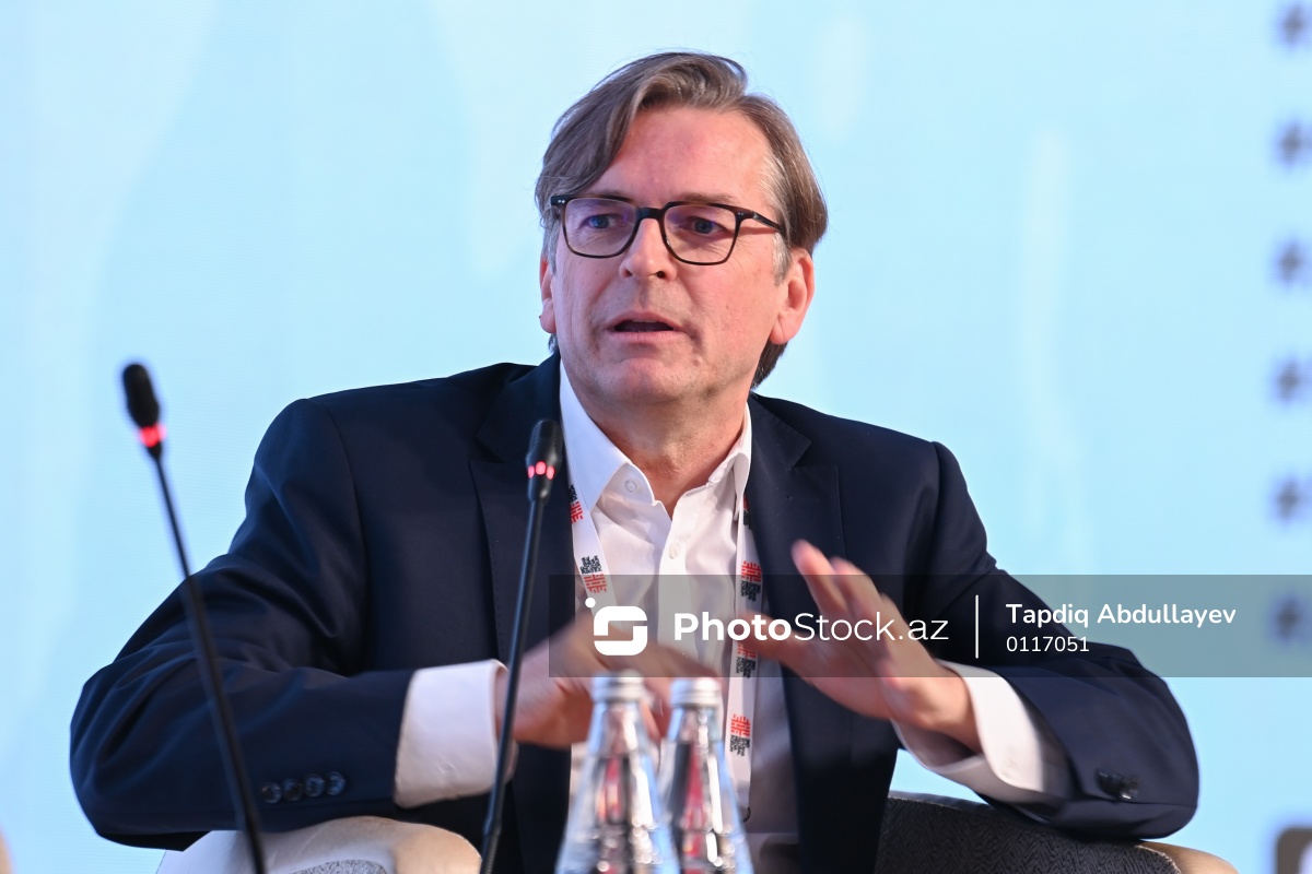 III Şuşa Qlobal Media Forumunun üçüncü günü çərçivəsində keçirilən "Rəqəmsal keçidlər: süni intellekt dövründə informasiya və media dayanıqlılığının gücləndirilməsi" mövzusunda paneldə iştirak edən “Euronews”un baş icraçı direktoru Klaus Strunz.