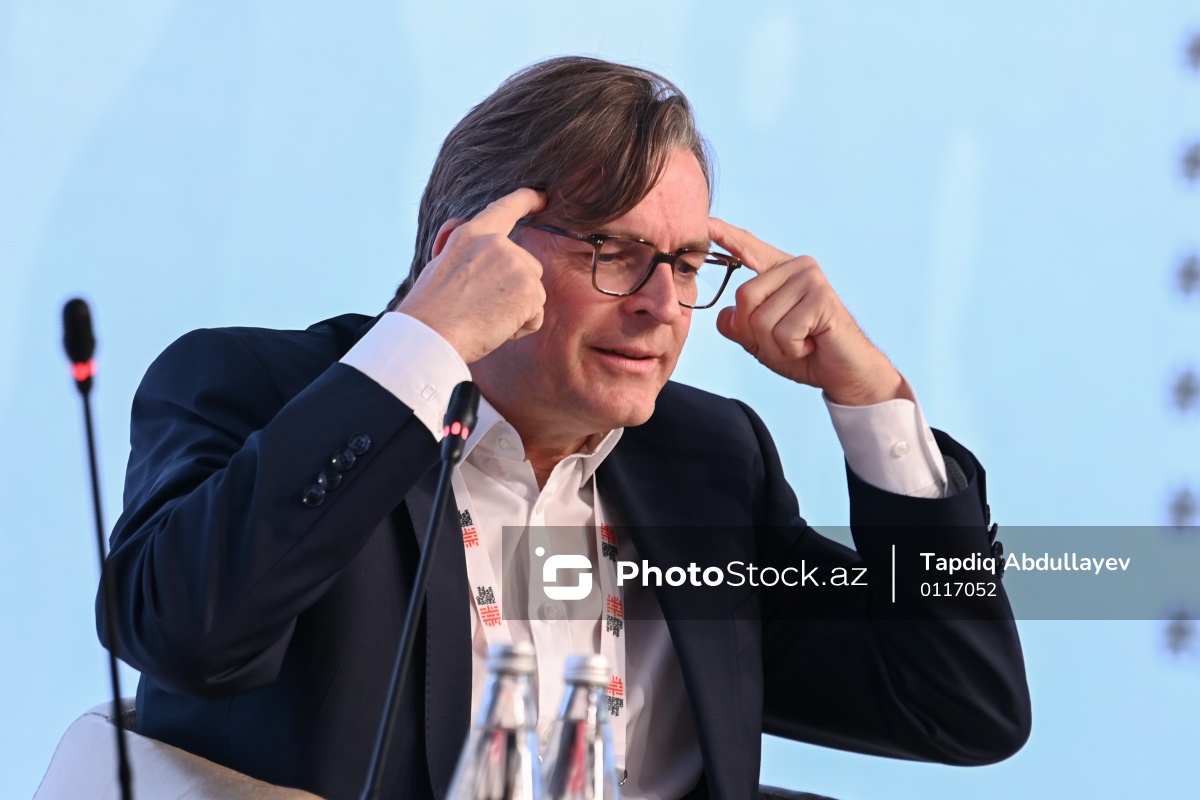 III Şuşa Qlobal Media Forumunun üçüncü günü çərçivəsində keçirilən  "Rəqəmsal keçidlər: süni intellekt dövründə informasiya və media dayanıqlılığının gücləndirilməsi" mövzusunda paneldə iştirak edən “Euronews”un baş icraçı direktoru Klaus Strunz.