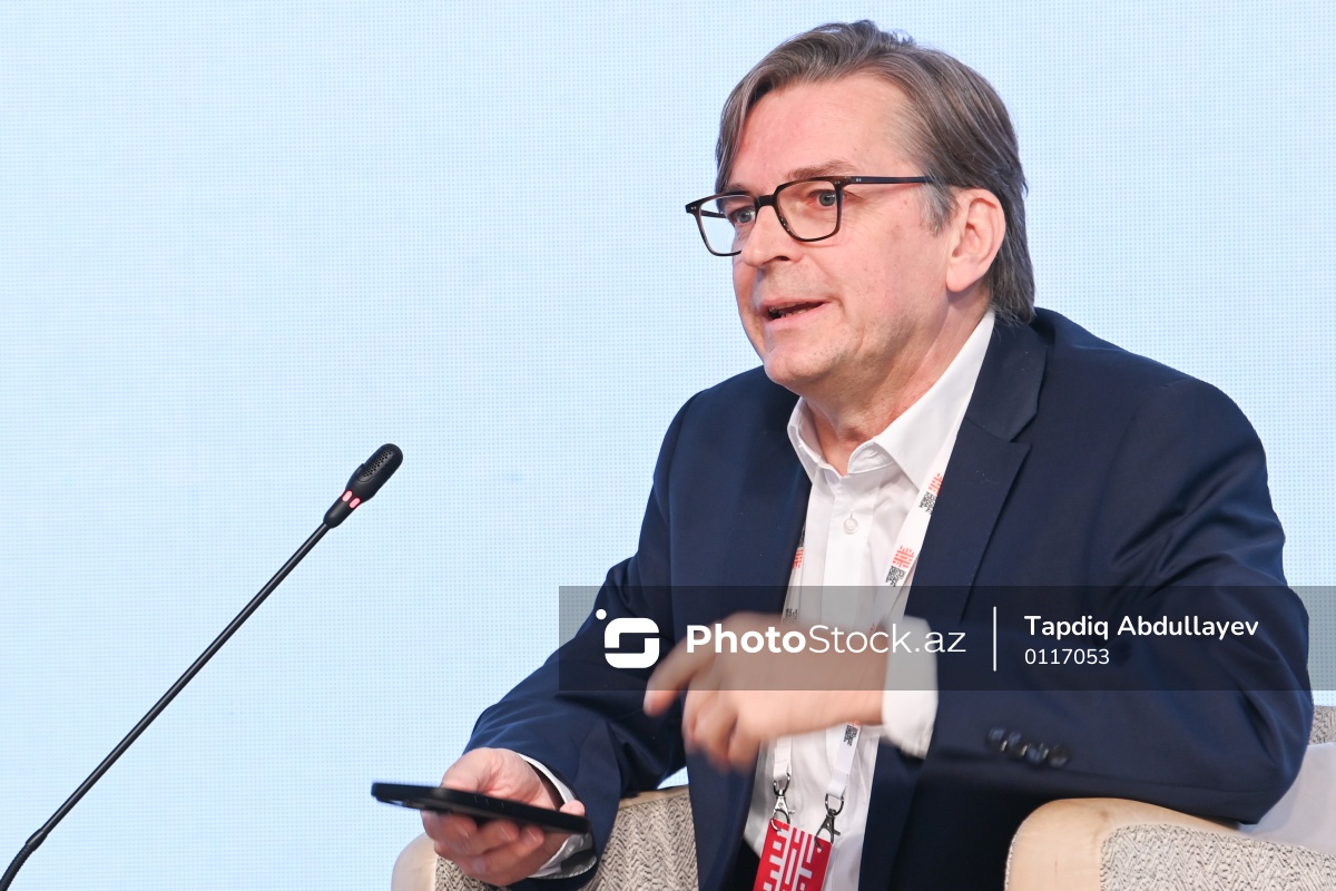 III Şuşa Qlobal Media Forumunun üçüncü günü çərçivəsində keçirilən  "Rəqəmsal keçidlər: süni intellekt dövründə informasiya və media dayanıqlılığının gücləndirilməsi" mövzusunda paneldə iştirak edən “Euronews”un baş icraçı direktoru Klaus Strunz.