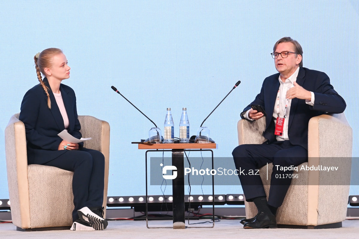 III Şuşa Qlobal Media Forumunun üçüncü günü çərçivəsində keçirilən  "Rəqəmsal keçidlər: süni intellekt dövründə informasiya və media dayanıqlılığının gücləndirilməsi" mövzusunda paneldə iştirak edən “AnewZ” telekanalının aparıcısı Katie Vilson (sol), “Euronews”un baş icraçı direktoru Klaus Strunz (sağ).