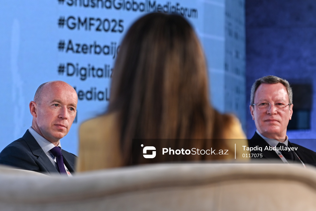 III Şuşa Qlobal Media Forumunun üçüncü günü çərçivəsində keçirilən “Sosial medianın təkamülü ictimai etimada necə təsir edir: Media savadlılığının əhatəsində” mövzusunda paneldə iştirak edən LinkedIn şirkətinin EMEA və LATAM regionları üzrə ictimai sektor, səhiyyə və qeyri-kommersiya satış sahələrinin rəhbəri Simas Klansi (sol), TikTok/ByteDance şirkətinin Rusiya, Şərqi Avropa, Mərkəzi Asiya və Monqolustan regionları üzrə ictimai siyasət və dövlət məsələləri şöbəsinin direktoru Sergey Sokolov (sağ).