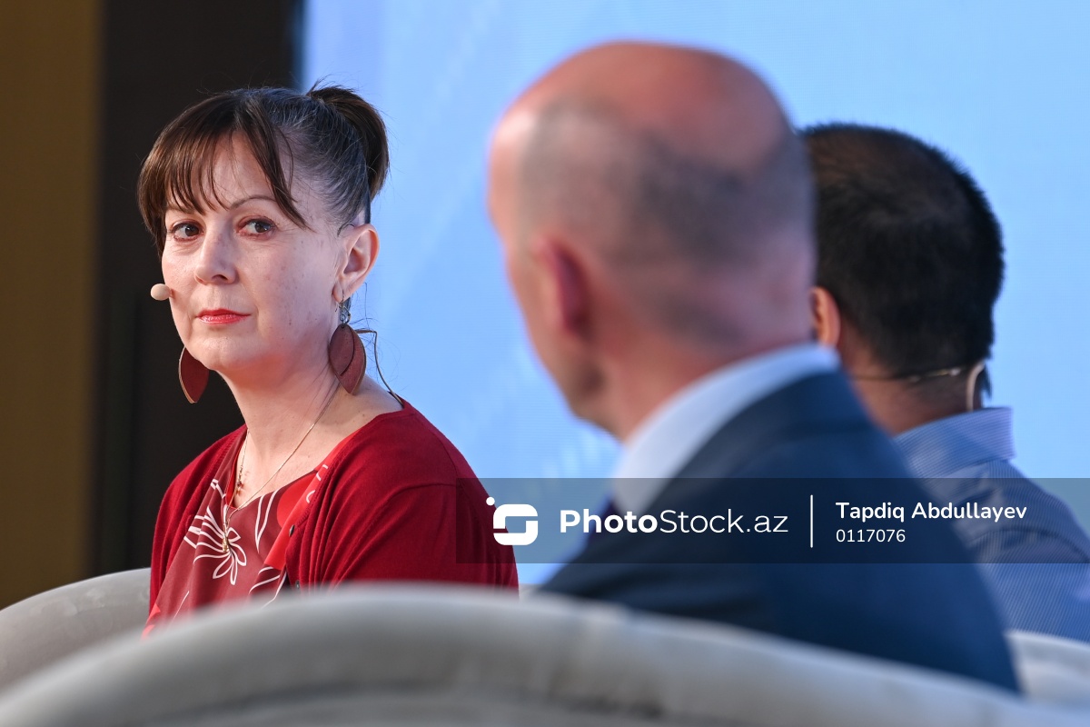 III Şuşa Qlobal Media Forumunun üçüncü günü çərçivəsində keçirilən  “Sosial medianın təkamülü ictimai etimada necə təsir edir: Media savadlılığının əhatəsində” mövzusunda paneldə iştirak edən Avstraliyadakı Sunshine Coast Universitetinin (UniSC) Biznes və Yaradıcı Sənayelər Məktəbinin ictimaiyyətlə əlaqələr üzrə baş müəllimi, sosial media üzrə təlimçi və tədqiqatçı Karen Sazerland.