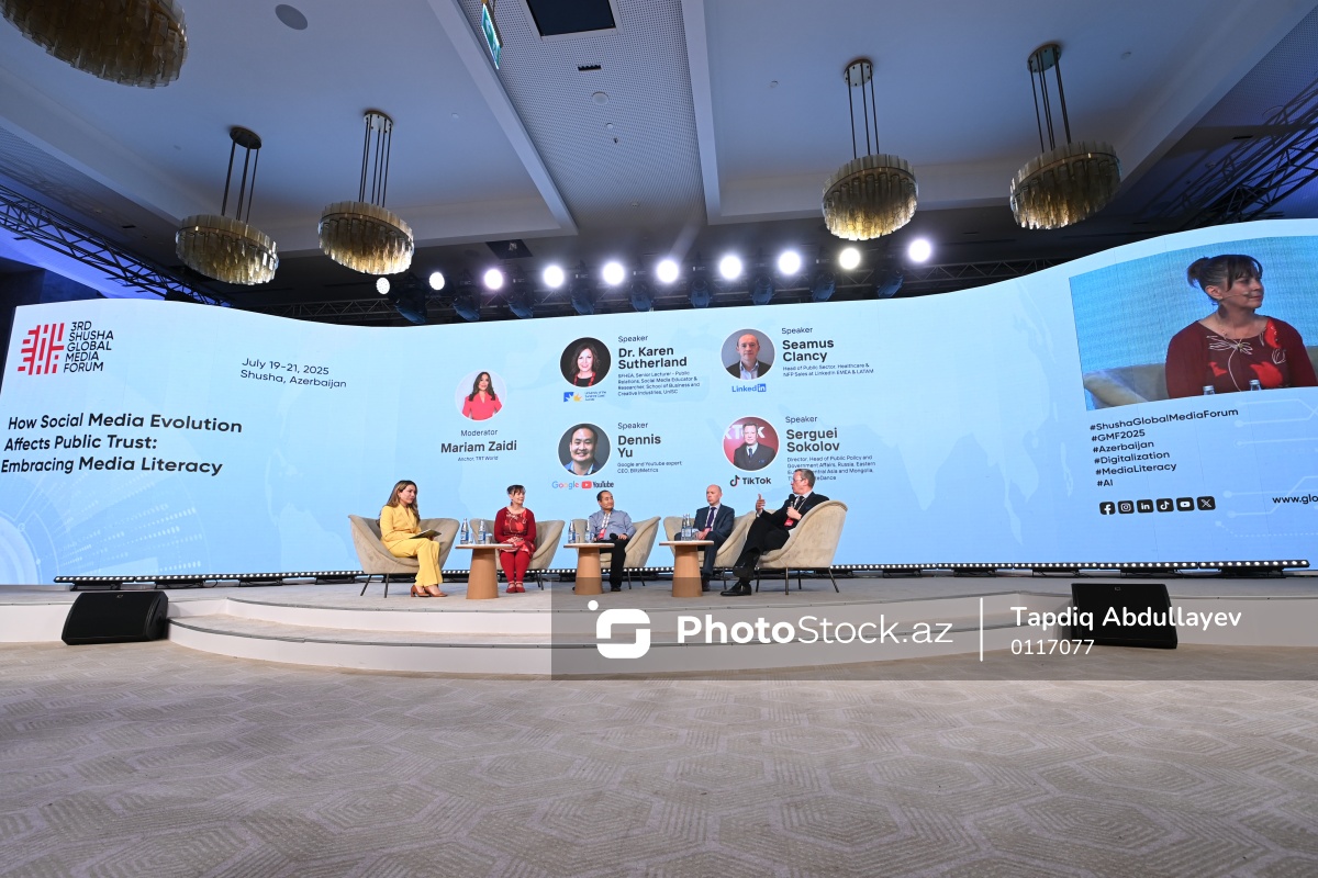 III Şuşa Qlobal Media Forumunun üçüncü günü çərçivəsində keçirilən  “Sosial medianın təkamülü ictimai etimada necə təsir edir: Media savadlılığının əhatəsində” mövzusunda paneldə iştirak edən (soldan-sağa) “TRT World” telekanalının aparıcısı Mariam Zaidi, Avstraliyadakı Sunshine Coast Universitetinin Biznes və Yaradıcı Sənayelər Məktəbinin ictimaiyyətlə əlaqələr üzrə baş müəllimi Karen Sazerland, Google və YouTube üzrə ekspert Dennis Yu, LinkedIn şirkətinin EMEA və LATAM regionları üzrə ictimai sektor, səhiyyə və qeyri-kommersiya satış sahələrinin rəhbəri Simas Klansi, TikTok/ByteDance şirkətinin Rusiya, Şərqi Avropa, Mərkəzi Asiya və Monqolustan regionları üzrə ictimai siyasət və dövlət məsələləri şöbəsinin direktoru Sergey Sokolov.