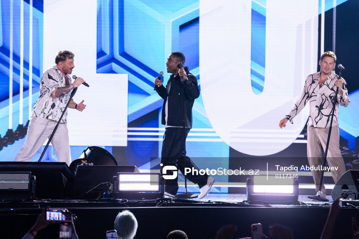 Bakıda keçirilən "DREAM FEST 2025" Beynəlxalq Musiqi Festivalında iştirak edən “Blue” qrupunun üzvləri (soldan-sağa) Duncan James, Simon Webbe, Lee Ryan.