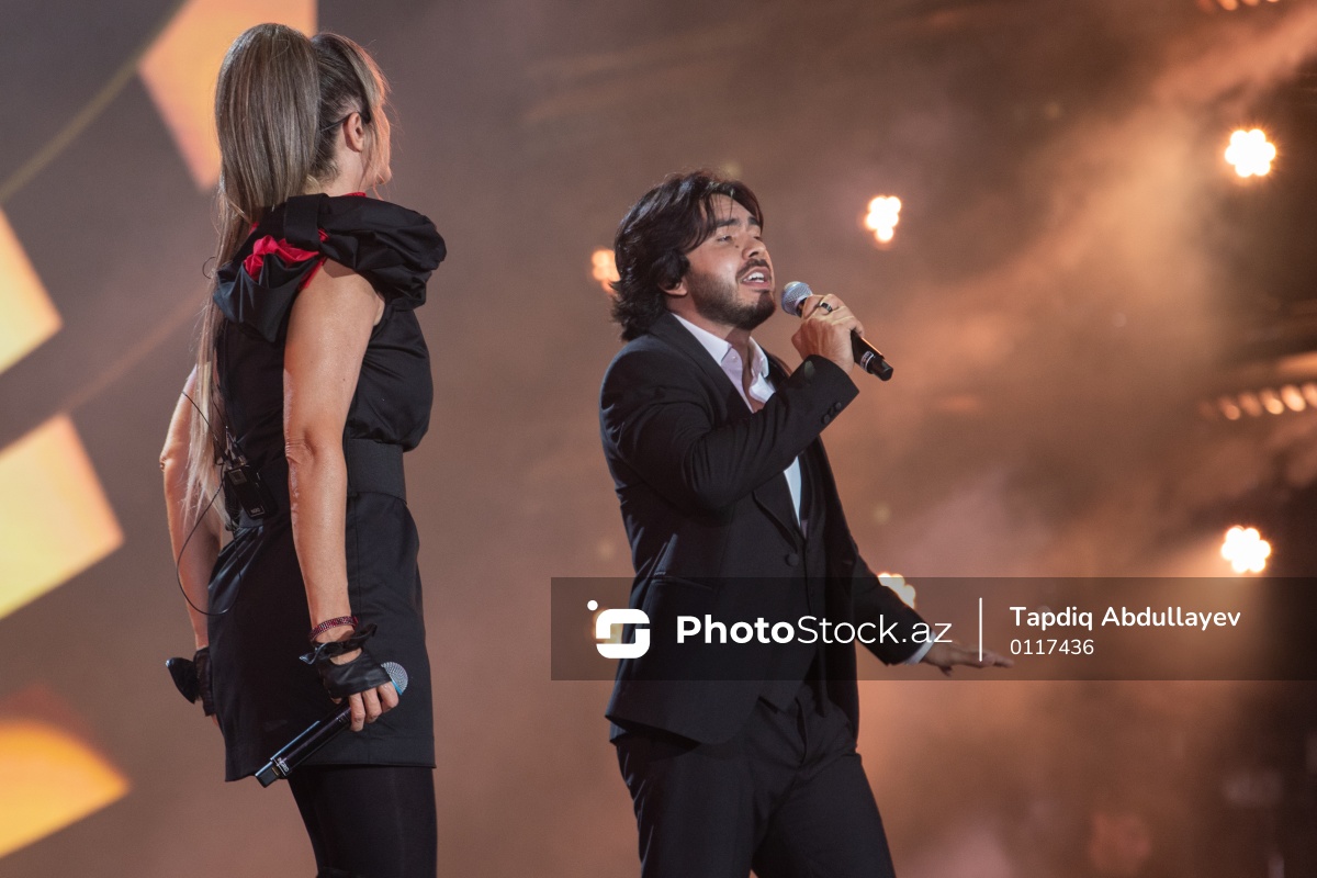 Bakıda keçirilən “Dream FEST – 2025” Beynəlxalq Musiqi Festivalının üçüncü günündə iştirak edən italiyalı müğənni İngrid Alberini (sol), müğənni Vaqif Nağıyev (sağ).
