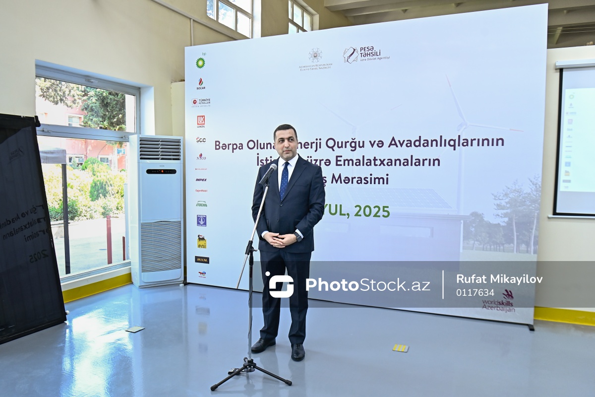 Bərpa olunan enerji qurğu və avadanlıqlarının istismarı üzrə emalatxanaların açılış mərasimində iştirak edən Peşə Təhsili üzrə Dövlət Agentliyinin direktoru Ceyhun Kərəmov.