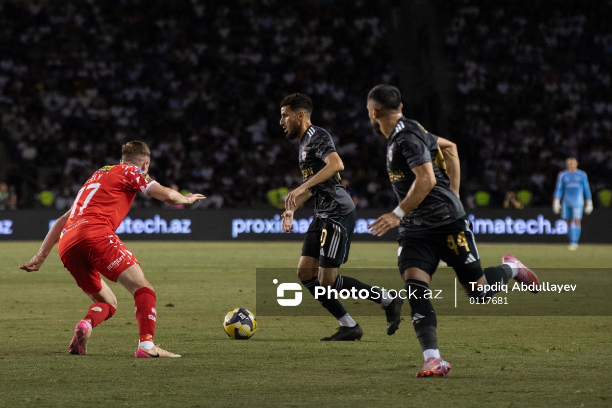 30.07.2025 Tofiq Bəhramov adına Respublika stadionu, UEFA Çempionlar Liqasının “Qarabağ” - "Şelburn" oyununda "Şelburn"nun oyunçusu Daniel Kelly (sol) və “Qarabağ”ın oyunçuları Abdullah Zubir, Elvin Cəfərquliyev (sağ) mübarizəsi.