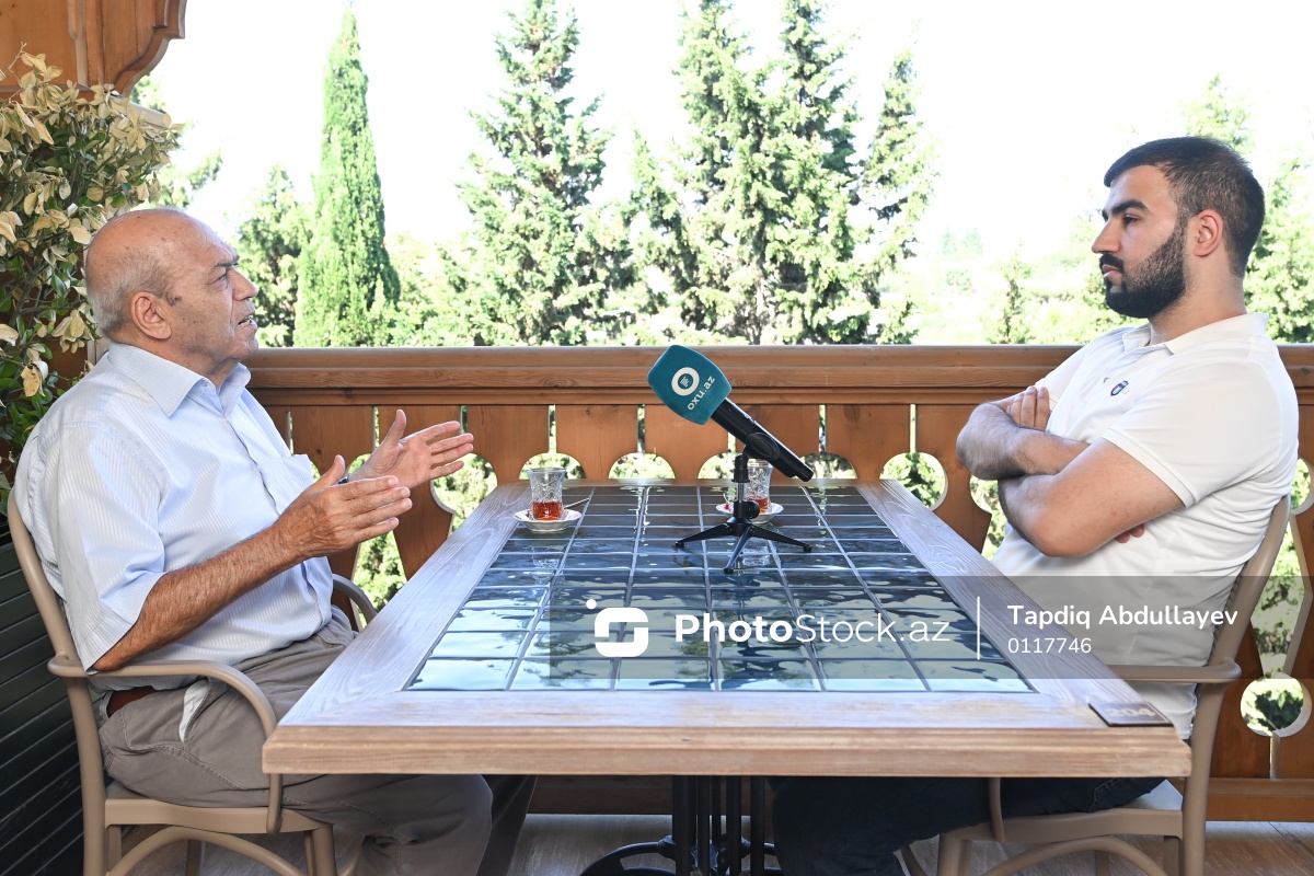 Filologiya elmləri doktoru, professor, dilçi alim Fəxrəddin Veysəlli (sol), müxbir Məhərrəm Əliyev (sağ).