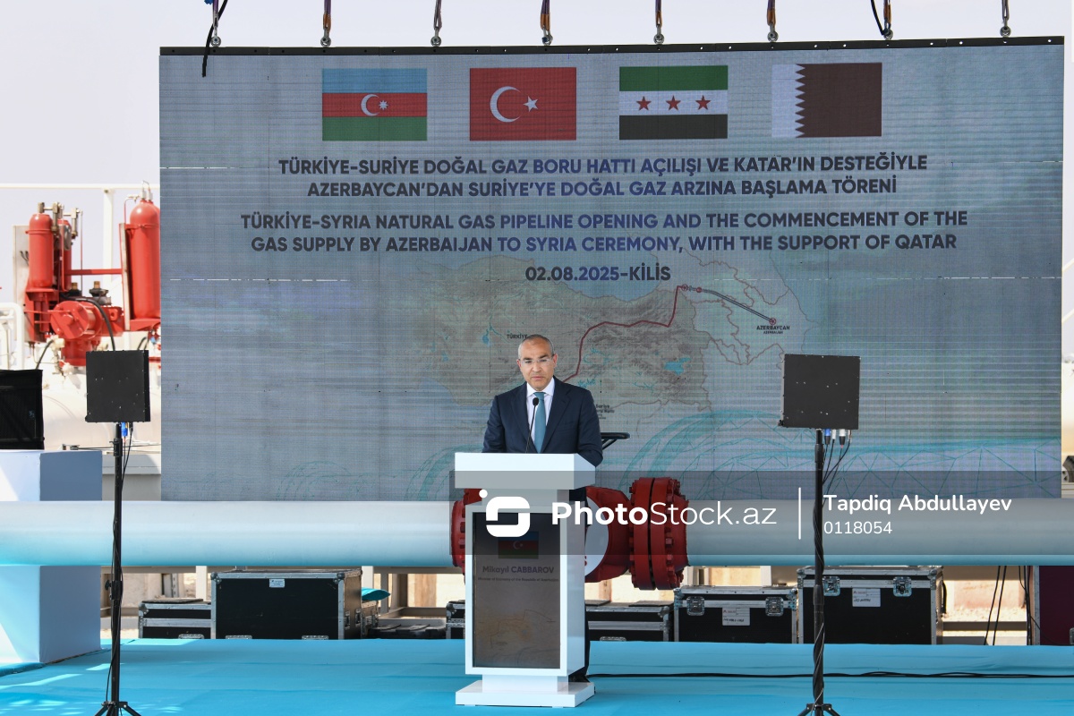 Türkiyənin Kilis şəhərinin Yavuzlu kəndində Türkiyə-Suriya qaz boru kəmərinin açılış mərasimində çıxış edən Azərbaycan Respublikasının iqtisadiyyat naziri, SOCAR-ın Müşahidə Şurasının sədri Mikayıl Cabbarov.