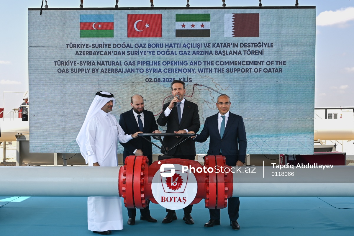 Türkiyənin Kilis şəhərinin Yavuzlu kəndində Azərbaycan qazının Türkiyə ərazisindən Suriyaya nəqlini təmin edəcək Türkiyə-Suriya təbii qaz boru kəmərinin rəsmi açılış mərasimində iştirak edən (soldan-sağa) Qətər İnkişaf Fondunun rəhbəri Fəhad Həmad Həssan Əl-Sulaiti, Suriyanın energetika naziri Məhəmməd Əl Bəşir, Türkiyənin energetika və təbii sərvətlər naziri Alparslan Bayraktar və Azərbaycanın iqtisadiyyat naziri Mikayıl Cabbarov.