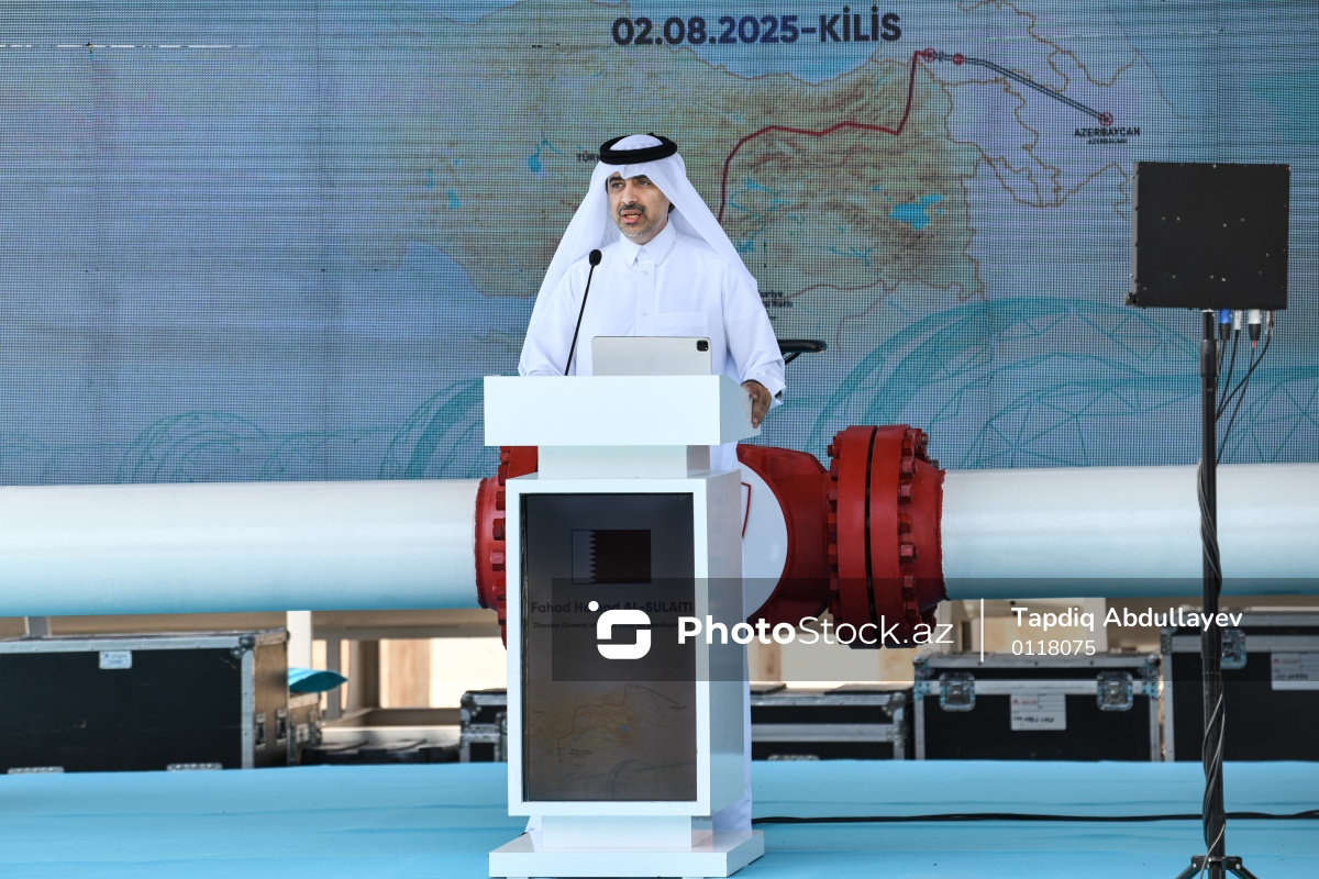 Türkiyənin Kilis şəhərinin Yavuzlu kəndində Türkiyə-Suriya qaz boru kəmərinin açılış mərasimində çıxış edən Qətər İnkişaf Fondunun rəhbəri Fəhad Həmad Həssan Əl-Sulaiti.