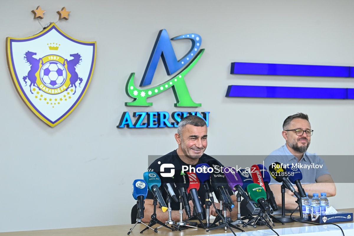UEFA Çempionlar Liqasının III təsnifat mərhələsində "Qarabağ"-"Şkendiya" oyunu öncəsi keçirilən mətbuat konfransında "Qarabağ"ın baş məşqçisi Qurban Qurbanov (sol) və klubun mətbuat katibi Anar Hacıyev (sağ).