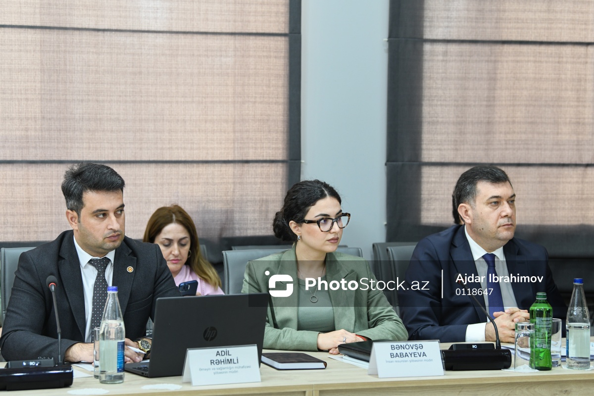(soldan-sağa) Azərbaycan Həmkarlar İttifaqları Konfederasiyasının əməyin və sağlamlığın mühafizəsi şöbəsinin müdiri Adil Rəhimli, Azərbaycan Həmkarlar İttifaqları Konfederasiyasının insan resursları şöbəsinin müdiri Bənövşə Babayeva, Azərbaycan Əmək və Sosial Münasibətlər Akademiyasının rektoru Yusif Ağayev.