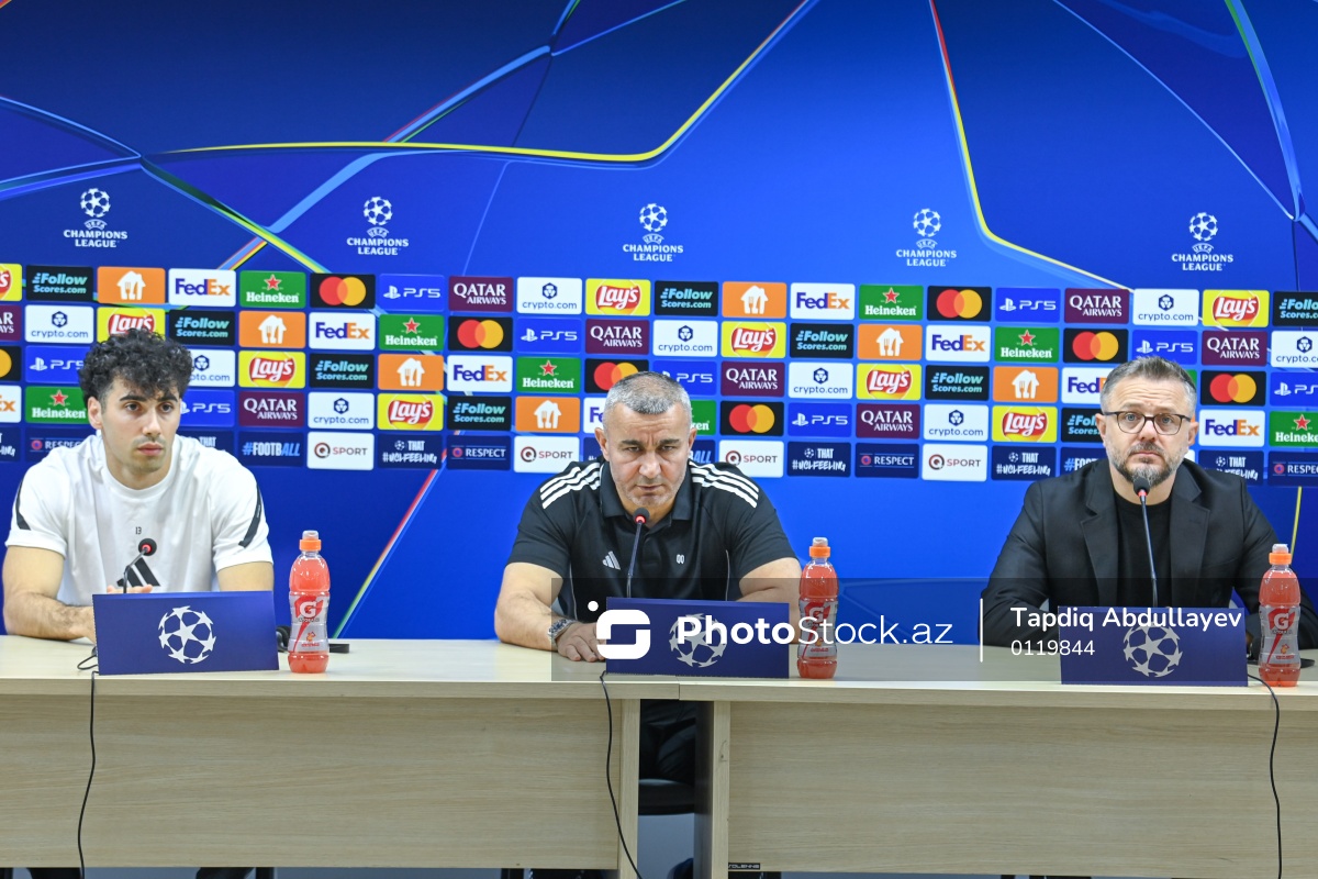 (soldan-sağa) "Qarabağ"ın futbolçusu Bəhlul Mustafazadə, "Qarabağ" futbol klubunun baş məşqçisi Qurban Qurbanov, "Qarabağ" futbol klubunun mətbuat katibi Anar Hacıyev.