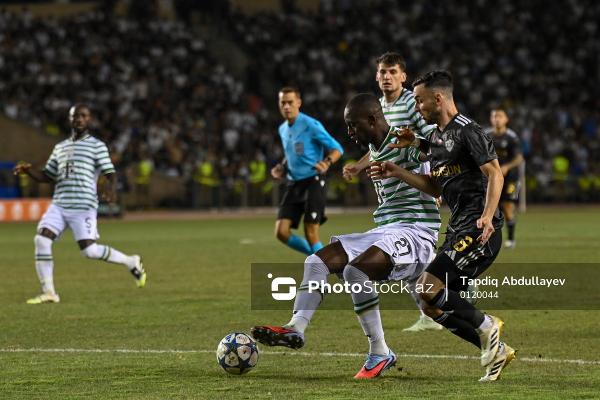 27.08.2025 Tofiq Bəhramov adına Respublika stadionu, UEFA Çempionlar Liqasının “Qarabağ” - “Ferentsvaroş" oyununda “Ferentsvaroş"un oyunçusu Ibrahim Cisse (sol), “Qarabağ”ın oyunçusu Marko Yankoviç (sağ) mübarizəsi.
