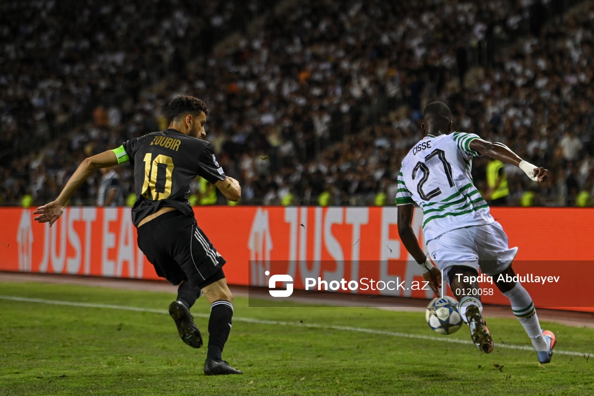 27.08.2025 Tofiq Bəhramov adına Respublika stadionu, UEFA Çempionlar Liqasının “Qarabağ” - “Ferentsvaroş" oyununda “Qarabağ”ın oyunçusu Abdullah Zubir (sol), “Ferentsvaroş"un oyunçusu Ibrahim Cissenin (sağ) mübarizəsi.