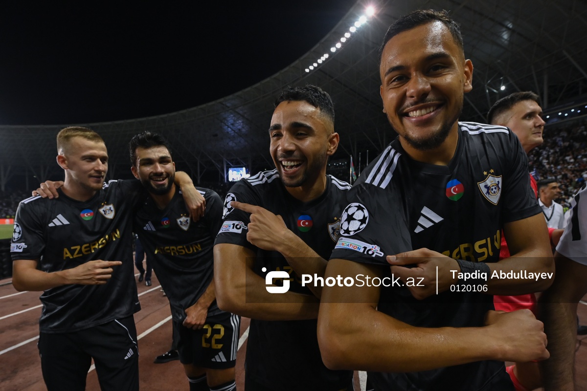 27.08.2025 Tofiq Bəhramov adına Respublika stadionu, UEFA Çempionlar Liqasının “Qarabağ” - “Ferentsvaroş" oyununda “Qarabağ”ın futbolçuları Leandro Andrade (sol) və Dani Bolt (sağ).